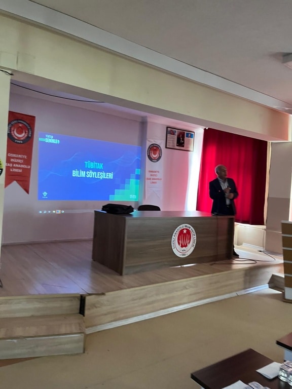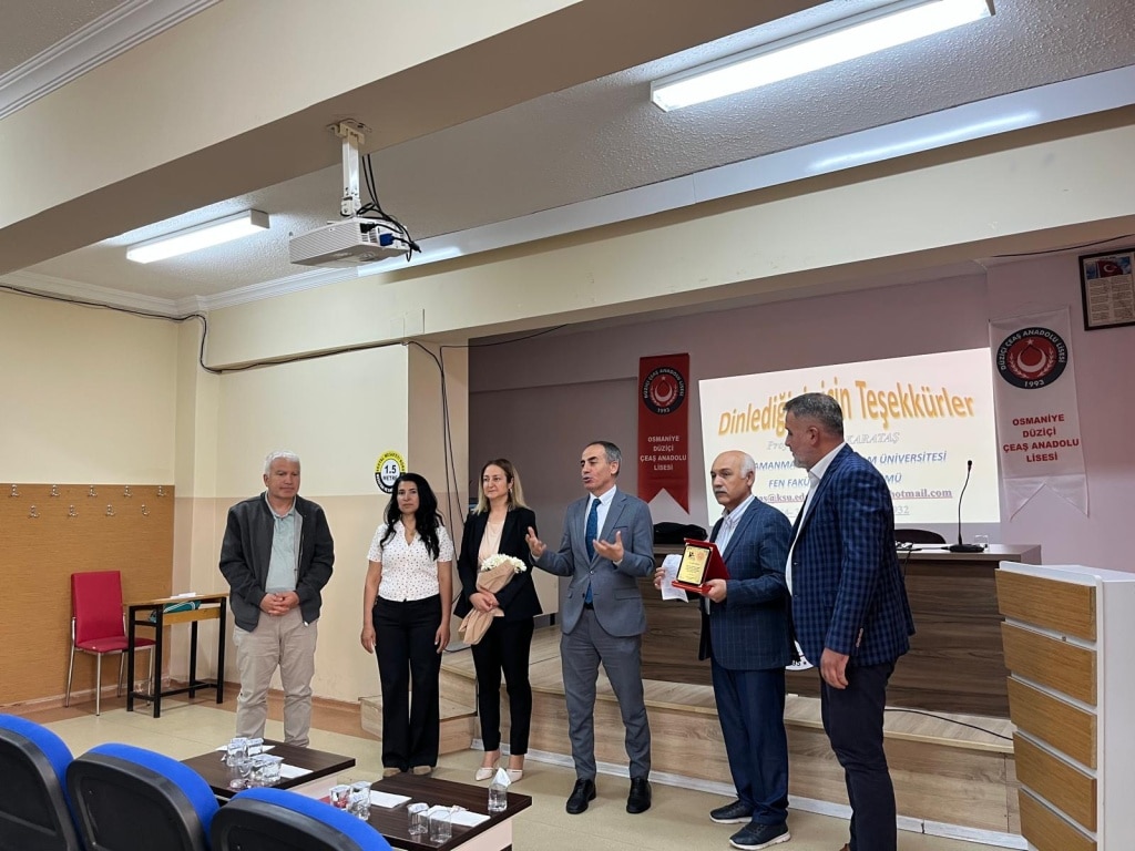 Düziçi Çeaş Anadolu Lisesi olarak Bilim ve Teknoloji ile inşaa ettiğimiz Türkiye Yüzyılında Tübitak Bilim ve Toplum Başkanlığı tarafından ortaöğretim öğrencilerimizde Bilimsel farkındalığı arttırmak ve bilim iletişimini toplumun tümüne yaymak için düzenlenen ‘’TÜBİTAK Bilim Söyleşileri’’ kapsamında Okul müdürümüz F.Sulhay Doğan Burgaç öncülüğünde ve okulumuz Biyoloji öğretmeni Nazan GÖK yürütücülüğünde Sayın İlçe Milli Eğitim Müdürümüz Cuma SAĞIR ve Osmaniye Korkut Ata Üniversitesinden Dr. Öğrt. Üyesi Halil ÖZERLİ’ nin de katılımı ile gerçekleştirildi. Bilim söyleşilerine konuşmacı olarak gelen Kahramanmaraş Sütçü İmam Ünv. Fen- Edebiyat Fakültesi Fizik Bölümü Öğretim üyesi Prof.Dr. Şükrü KARATAŞ Malzeme Bilimi ve Nanoteknoloji konusunda Fizik Biliminin Dünü, Bugünü ve Yarını= NANOTEKNOLOJİ konulu söyleşisini fen bilimlerine ilgi duyan öğrencilerimize yönelik konferansıyla bilgilendirdi.